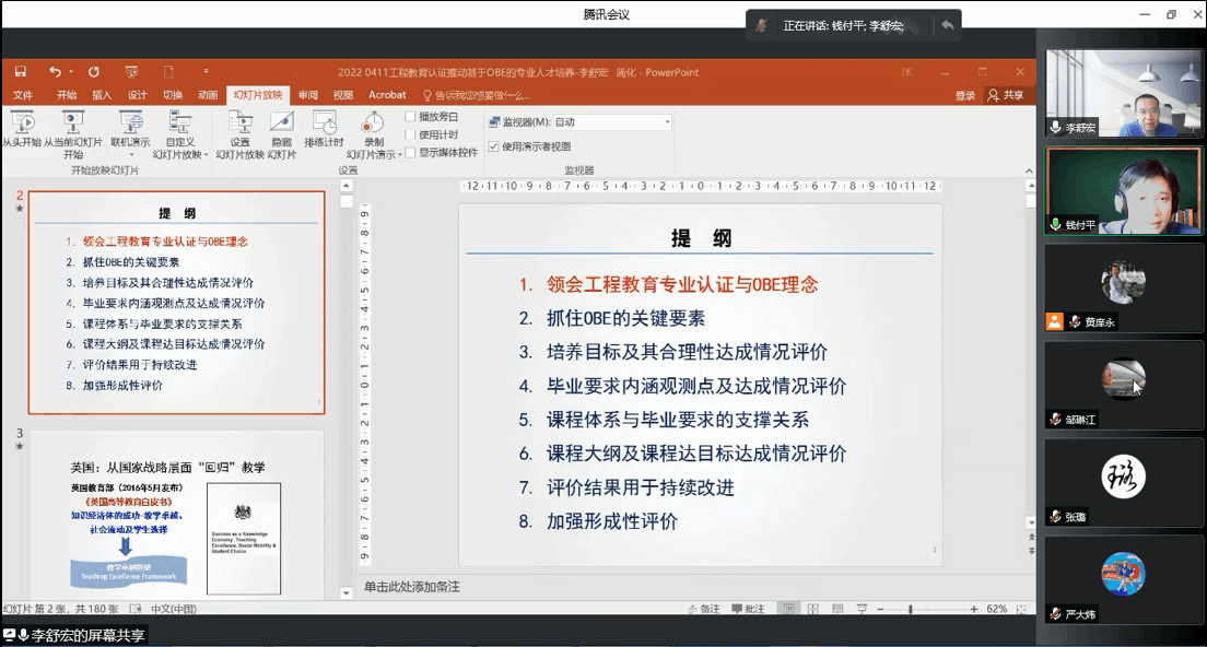 2022年4月11日下午,东南大学英国正版365官方网站副经理李舒宏教授应邀为公司做了题为“基于OBE理念的专业人才培养--工程教育认证”的专题讲座,受疫情影响,讲座通过线上会议方式进行,由经理钱付平教授主持,能动系全体教师和部分环境系教师近50人聆听了报告。