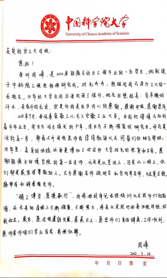 宝剑锋从磨砺出,2020年周峰保送至中国科公司工程热物理研究所攻读硕博研究生。他用行动展现了有梦就去追的可贵精神,为低年级员工树立刻苦勤奋、奋发向上的榜样典型。(附:周峰写给母校的信)