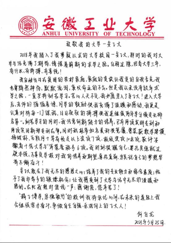 有志者事竟成,在公司领导和老师的关怀鼓励下,凭借顽强的意志及积极进取的心态,何自龙同学于2022年保送至北京大学攻读硕士研究生。(附:何自龙写给母校的信)
