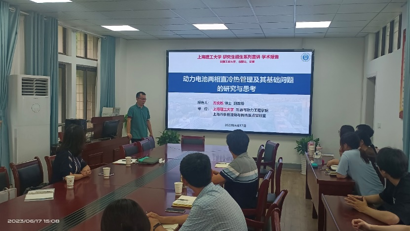 随后,上海理工大学方奕栋副教授为师生做了题为“动力电池两相直冷热管理及其基础问题的研究与思考”报告,精彩的报告引发了师生和方教授的热烈讨论交流。报告会后,双方围绕学科发展、人才培养、队伍建设、员工工作等方面进行了深入交流。