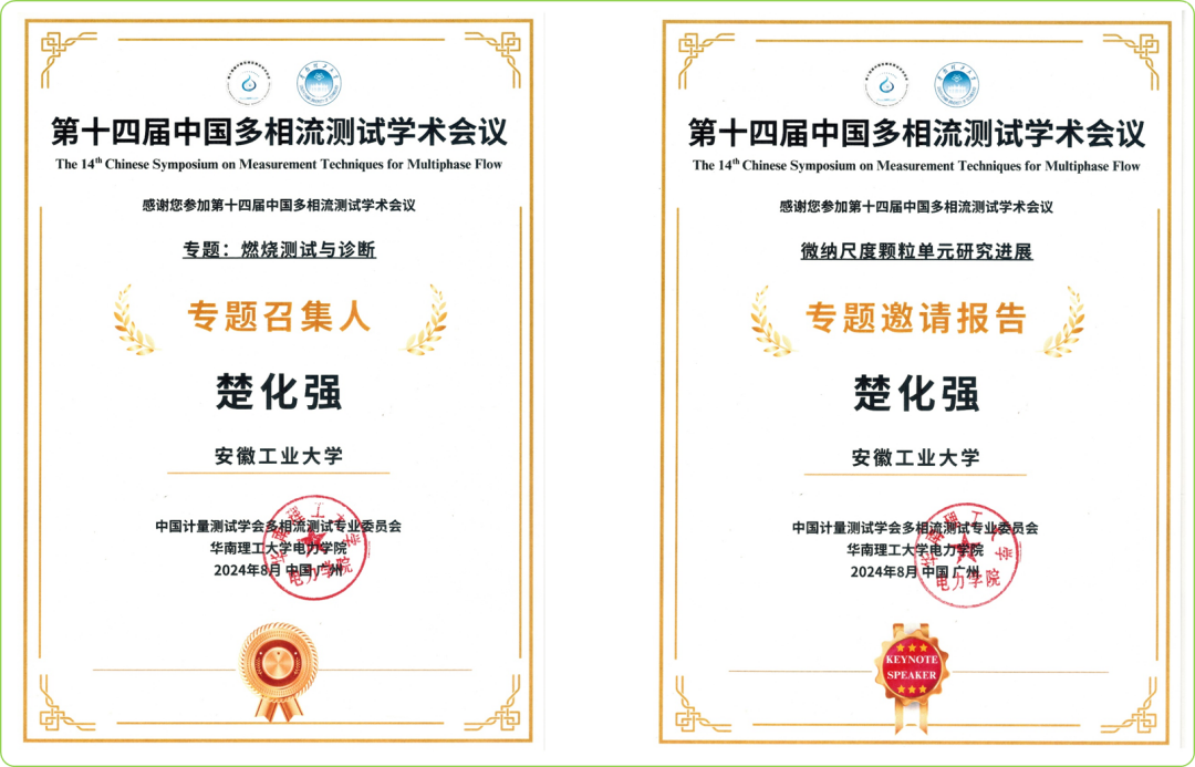 会议期间,楚化强受邀担任“燃烧测试与诊断”分会场主席,并携团队在“颗粒,液滴与气泡测量技术”分会场做了题为“微纳尺度颗粒单元研究进展”的特邀报告。报告重点介绍了楚化强团队近期在微尺度气泡、液滴动力学及碳烟颗粒物方面的研究进展,引起了参会师生的极大兴趣。