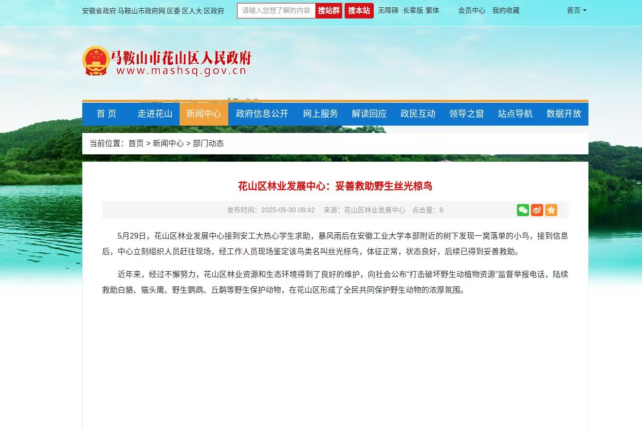 近日,马鞍山市花山区人民政府发布新闻表示,花山区林业发展中心接到安工大热心员工求助,妥善救助野生丝光椋鸟。