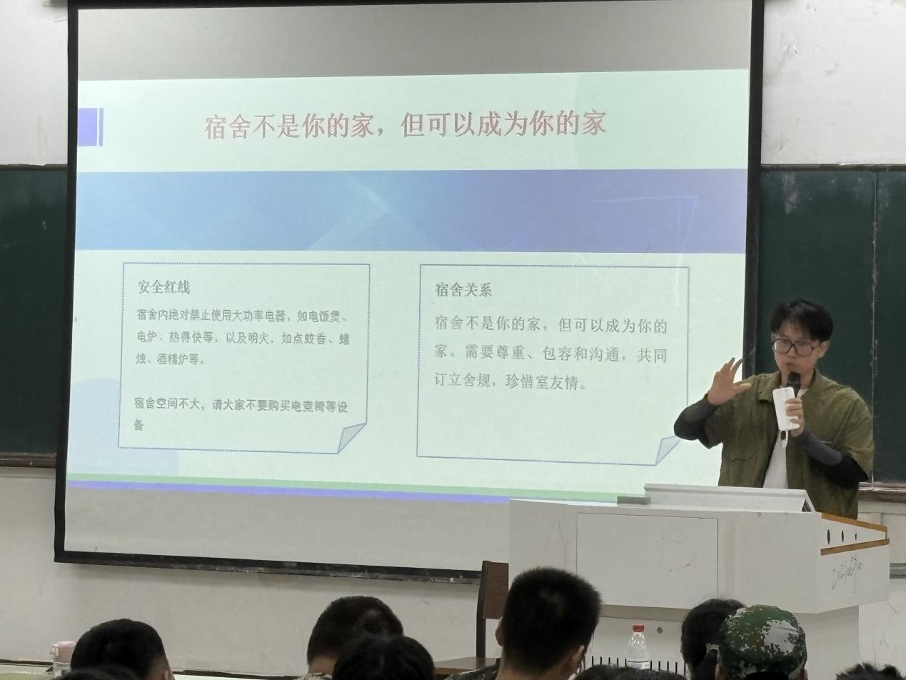 辅导员黄乐远从适应老员工活的角度出发,为新生们梳理了入学阶段需注意的关键事项,涵盖学习规划、心理调适、人际交往等方面,助力同学们顺利开启大学新篇章。随后,辅导员赵杨就本次军训的具体安排、作息制度、纪律要求等作了详细说明,并提醒同学们注意自我防护、积极融入集体,以饱满的精神状态完成训练任务。