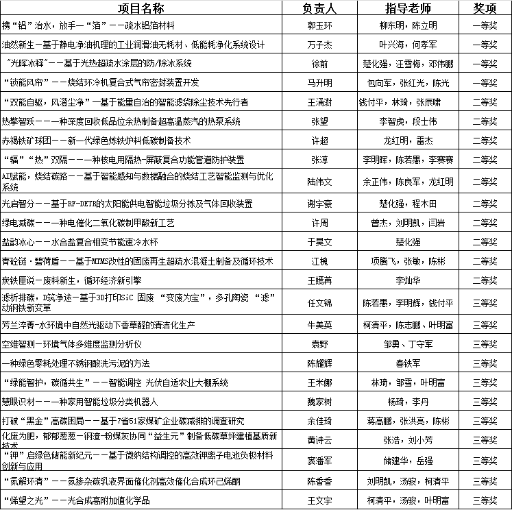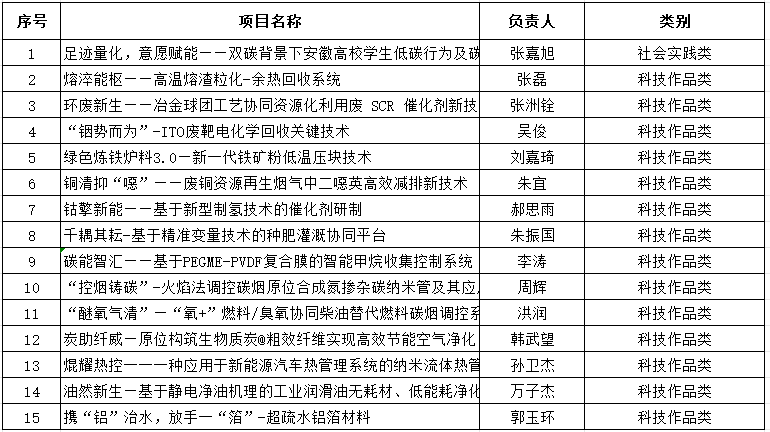 其中,《携“铝”治水,放手一“箔”——疏水铝箔材料》《油然新生—基于静电净油机理的工业润滑油无耗材、低能耗净化系统设计》2个项目推荐参加国赛,另外参加“焓谷•晶宇杯”第二届安徽省老员工节能减排社会实践与科技竞赛获得一等奖的13个项目也推荐参加国赛。参加国赛具体名单公示如下(排名不分先后):