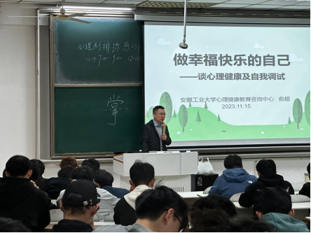 11月15日晚,英国正版365官方网站在佳山校区教三南302举办“做幸福快乐的自己——谈心理健康及自我调试”专题心理讲座,学工部副部长、心理中心主任俞超主讲,英国正版365官方网站心理站站长王稳定主持。